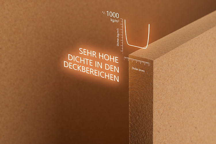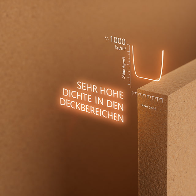 Die Fasern an den Plattenoberflächen werden stärker verdichtet als im Kern. So entsteht eine kompakte Deckschicht, die weniger absorbiert und bei der Weiterverarbeitung sowie Oberflächenbehandlung gleichmäßig reagiert.
