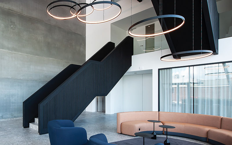 "A real eye-catcher in the office environment is the bar with cabinets and table and worktops in Elegant Black HPL. In the back wall of the bar, you can see the fine slat pattern of the steps again. In the meeting room and creative corner of the office, we again highlighted Moderna blue with Ink Blue HPL.”