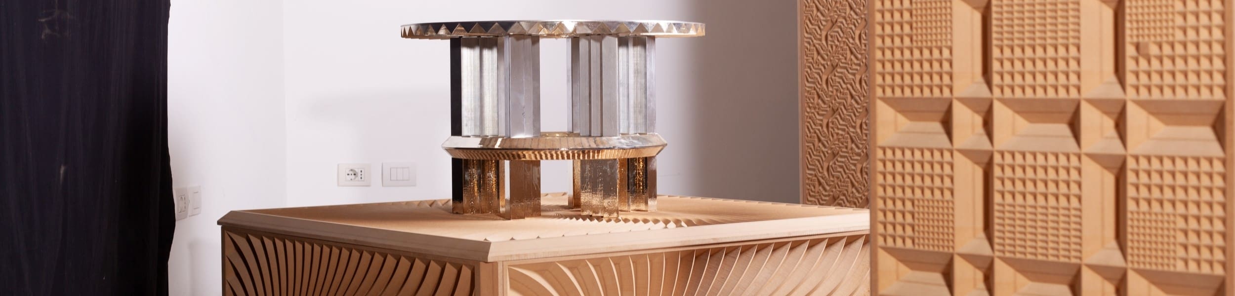 Designer Arno Hoogland is presenting his very first solo show in Milan and it is definitely worth visiting. His installation Deus Ex Machina invites his CNC machine to think along, make decisions and even share the limelight. The result is a futuristic temple, constructed from sculptural blocks of our Fibralux Biobased MDF: the world’s first MDF board based on 100% recovered wood and plant-based glue. Arno doesn’t see MDF as a simple building material, but as a canvas full of potential.