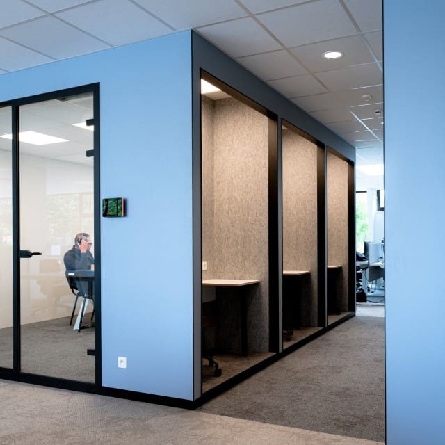 Setting up temporary offices isn’t done in a flash. Or is it? Thanks to the combination of JUUNOO metal studs and our Clicwall panels, the workspaces at Lantis were up in no time. “Clicwall’s high construction speed makes the process extremely cost-efficient,” says Stijn De Sutter, Commercial Manager Europe at JUUNOO. At the same time, Clicwall offers a wide range of designs so the look can be fully custom-tailored as well. Lantis went for a fresh colour combination of Silver blue, Roasted brown and Industrial green.