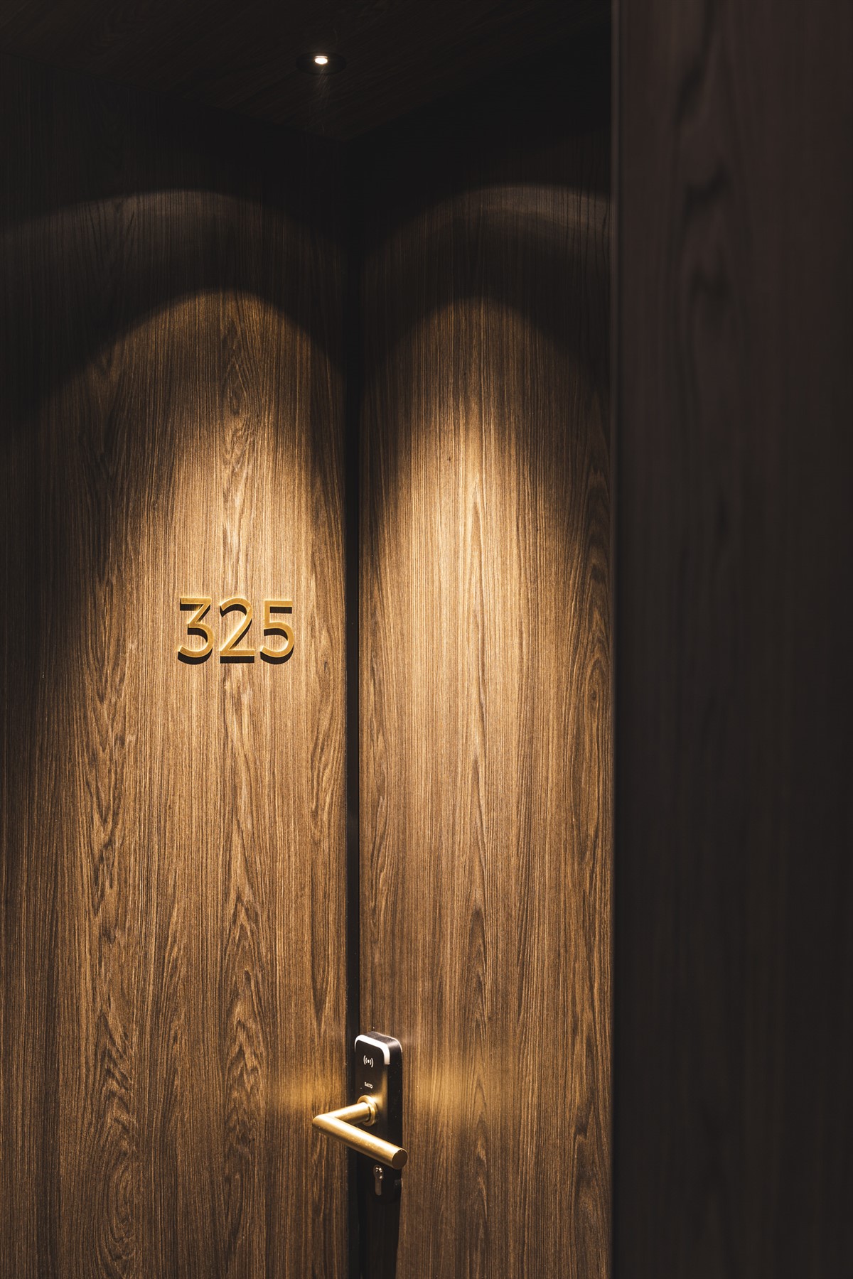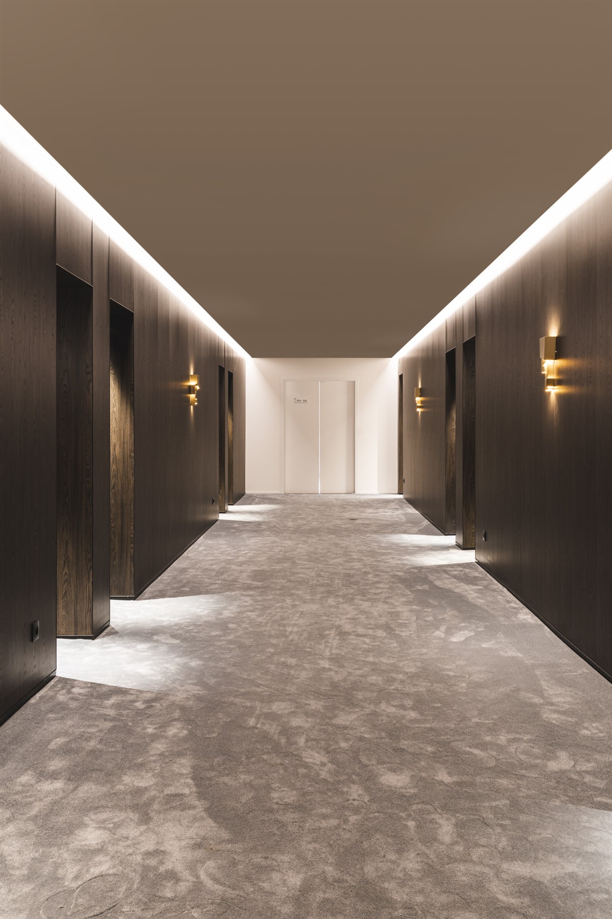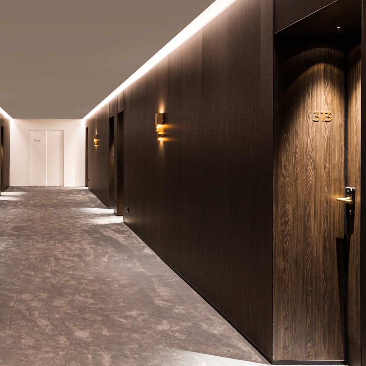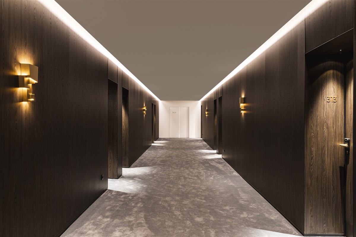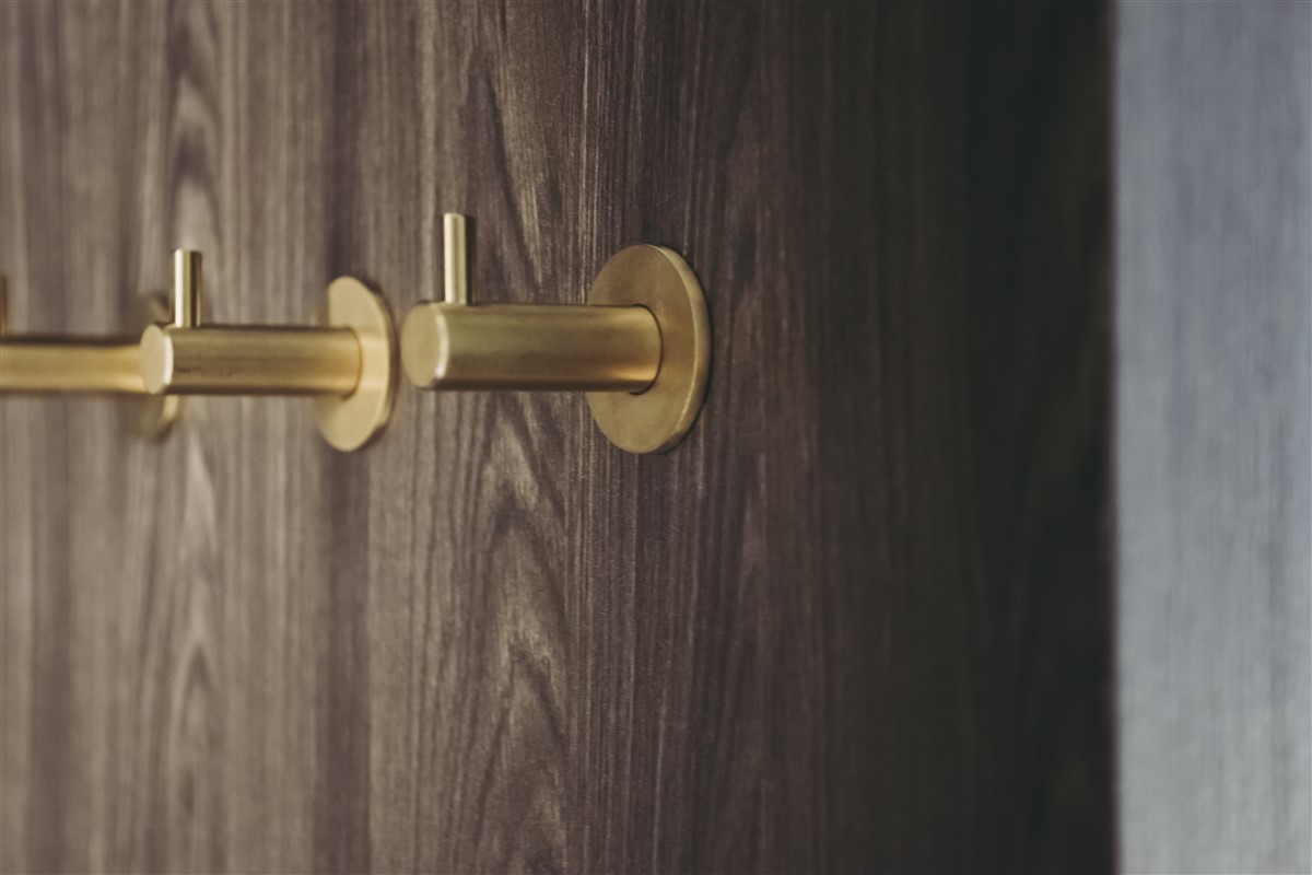 In the corridors, partition walls have been placed with the Clicwall system in H265 V1A Dainty Oak café noir. This design has also been continued in the furnishing of the rooms. They combined the Dainty Oak design in the open cabinets with brass accents and black.