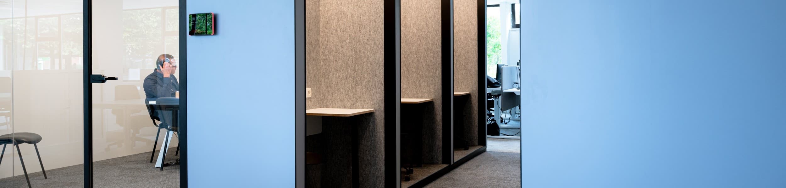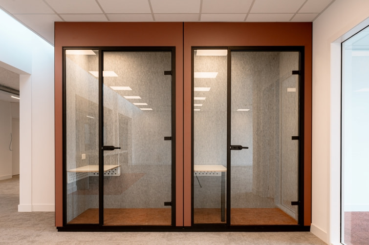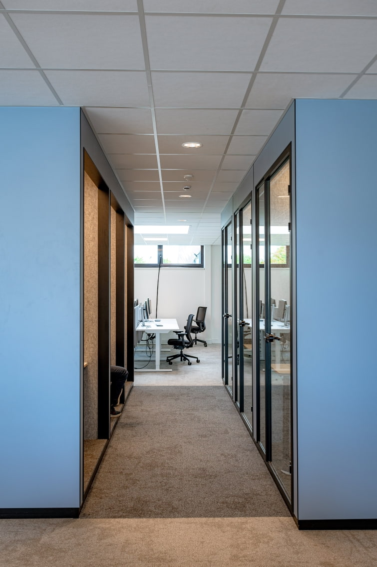 Setting up temporary offices isn’t done in a flash. Or is it? Thanks to the combination of JUUNOO metal studs and our Clicwall panels, the workspaces at Lantis were up in no time. “Clicwall’s high construction speed makes the process extremely cost-efficient,” says Stijn De Sutter, Commercial Manager Europe at JUUNOO. At the same time, Clicwall offers a wide range of designs so the look can be fully custom-tailored as well. Lantis went for a fresh colour combination of Silver blue, Roasted brown and Industrial green.
