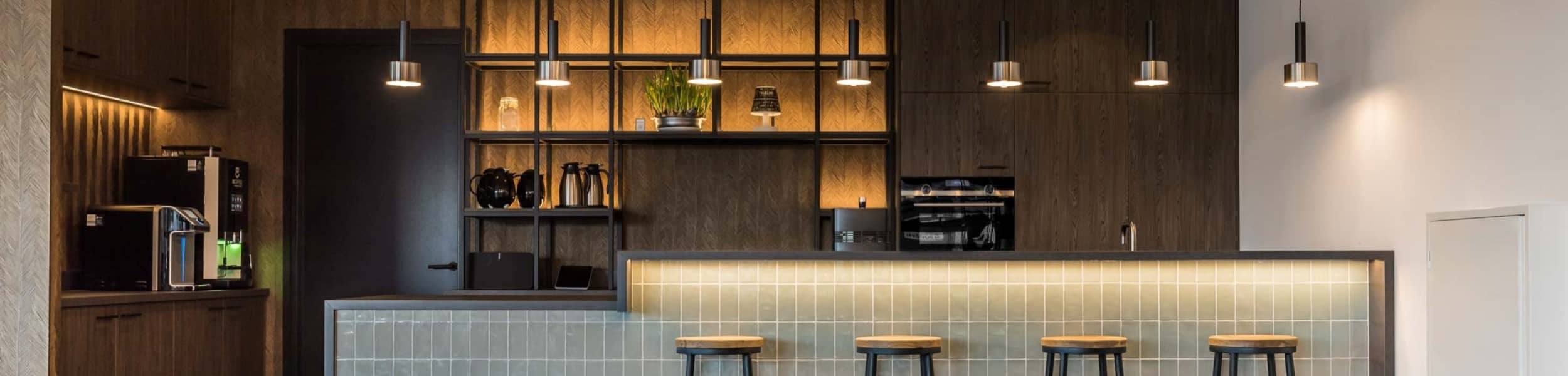 Art2Go wanted to strike a balance between corporate and fun. Desk units made from UNILIN Evola panels in Elegant Black and Dainty Oak Café Noir are a beautiful foil to the kitchen worktops in Ceppo Mineral Grey.The contrast between the light tiles and dark wood creates a relaxed atmosphere, suitable for both business meetings and relaxing moments.
