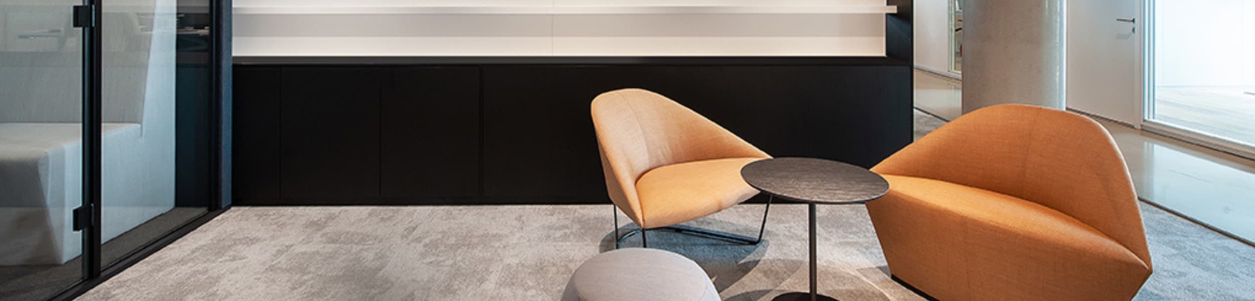 All the different materials that were used form a harmonious whole. “We worked on the basis of a serene colour palette that perfectly matches the floor designs and the furniture. Chairs and other pieces of furniture can be easily exchanged between rooms. At the same time, the office is also subtly branded, with a nod to the deep blue and bright orange of Unilin Group here and there.”