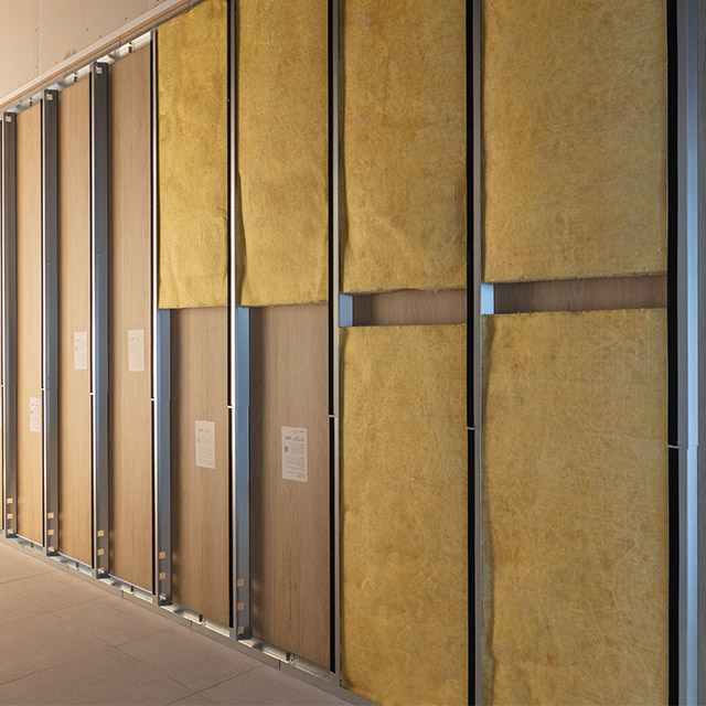 Akoestische isolatie geeft aan hoe goed het wandsysteem geluid tussen ruimtes beperkt. Deze waarde wordt uitgedrukt in dB en is berekend via Insul, een erkende simulatietool voor wand-, vloer- en plafondconstructies. Verschillende wandopbouwen met Clicwall en hun bijhorende akoestische isolatiewaarden kan je vinden in de Clicwall Systeemselector. Akoestische absorptie beschrijft hoeveel geluid een Clicwall wand opneemt binnen de ruimte zelf Dat vermindert echo en nagalm. De absorptie hangt af van de isolatie, luchtspouw en afwerkingslagen. Standaard Clicwall panelen hebben een absorptiewaarde van α = 0,1 tot 0,2.